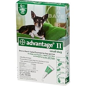 Biting fleas are more than just a nuisance for your dog. Left unchecked, they can cause serious disorders such as flea allergy dermatitis, secondary skin infections, tapeworms, and even anemia. This topical flea treatment lets you stop fleas before they become a problem. Used just once a month, it begins working in minutes, killing 98 to 100 percent of the fleas on dogs within 12 hours and 99 percent of flea larvae and eggs within 20 minutes. The dead fleas can't lay eggs, and the dead larvae and eggs can't hatch, breaking the flea's life cycle and halting the infestation in its tracks. Any new fleas your dog then encounters are killed within two hours, preventing re-infestation for as long as four weeks. In fact, Advantage II is so effective at breaking the flea's life cycle there's no need to treat your dog's environment. Applied before the start of flea season, it helps keep your dog from becoming infested in the first place. Used year-round, it prevents fleas from over-wintering in your home to feast on your dog next season. Gentle enough for puppies as young as seven weeks, Advantage II is water-resistant and continues to work while your dog swims or is bathed. The package includes four pre-measured doses for dogs 0-10 pounds in easy-to-use applicator tubes. For safety, keep out of the reach of children, and read all warnings and instructions carefully.