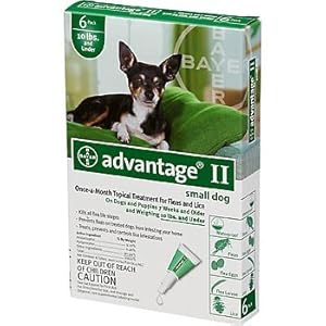 Biting fleas are more than just a nuisance for your dog. Left unchecked, they can cause serious disorders such as flea allergy dermatitis, secondary skin infections, tapeworms, and even anemia. This topical flea treatment lets you stop fleas before they become a problem. Used just once a month, it begins working in minutes, killing 98 to 100 percent of the fleas on dogs within 12 hours and 99 percent of flea larvae and eggs within 20 minutes. The dead fleas can't lay eggs, and the dead larvae and eggs can't hatch, breaking the flea's life cycle and halting the infestation in its tracks. Any new fleas your dog then encounters are killed within two hours, preventing re-infestation for as long as four weeks. In fact, Advantage II is so effective at breaking the flea's life cycle there's no need to treat your dog's environment. Applied before the start of flea season, it helps keep your dog from becoming infested in the first place. Used year-round, it prevents fleas from over-wintering in your home to feast on your dog next season. Gentle enough for puppies as young as seven weeks, Advantage II is water-resistant and continues to work while your dog swims or is bathed. The package includes six pre-measured doses for dogs 0-10 pounds in easy-to-use applicator tubes. For safety, keep out of the reach of children, and read all warnings and instructions carefully.