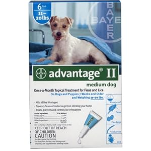 Biting fleas are more than just a nuisance for your dog. Left unchecked, they can cause serious disorders such as flea allergy dermatitis, secondary skin infections, tapeworms, and even anemia. This topical flea treatment lets you stop fleas before they become a problem. Used just once a month, it begins working in minutes, killing 98 to 100 percent of the fleas on dogs within 12 hours and 99 percent of flea larvae and eggs within 20 minutes. The dead fleas can't lay eggs, and the dead larvae and eggs can't hatch, breaking the flea's life cycle and halting the infestation in its tracks. Any new fleas your dog then encounters are killed within two hours, preventing re-infestation for as long as four weeks. In fact, Advantage II is so effective at breaking the flea's life cycle there's no need to treat your dog's environment. Applied before the start of flea season, it helps keep your dog from becoming infested in the first place. Used year-round, it prevents fleas from over-wintering in your home to feast on your dog next season. Gentle enough for puppies as young as seven weeks, Advantage II is water-resistant and continues to work while your dog swims or is bathed. The package includes six pre-measured doses for dogs 11-20 pounds in easy-to-use applicator tubes. For safety, keep out of the reach of children, and read all warnings and instructions carefully.