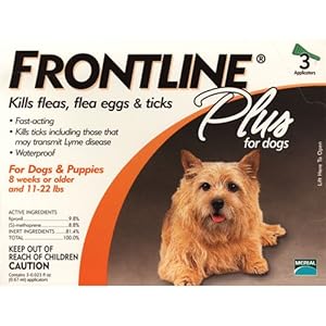 For dogs ; puppies 8 weeks or older and up to 22 pounds. Kills fleas, flea eggs, ticks ; chewing lice. Fast acting. Kills ticks including those that may transmit Lyme disease. Waterproof. Package contains (3) 0.023 fl oz (.067 ml) applicators. Directions for Use: To kill fleas, all stages of brown dog ticks, American dog ticks, lone star ticks, and deer ticks (which may carry Lyme disease) and chewing lice, apply to dogs or puppies (8 weeks or older) as follows: Remove applicator from child resistant package. Hold applicator upright and snap applicator tip away from face and body. Place applicator tip through animal's hair to the skin level between the shoulder blades. Squeeze applicator, applying entire contents in a single spot to the animal's skin. Avoid superficial application to the animal's hair. Only one applicator per treatment is needed. Frontline Plus aids in the control of sarcoptic mange infestations. Multiple monthly treatments are recommended for the elimination of mites. Frontline Plus for dogs can also be used for the treatment and control of flea, tick and chewing lice infestations on breeding, pregnant and lactating bitches. Frequency of Application: When used monthly, Frontline Plus for dogs completely breaks the flea life cycle and controls tick and chewing lice infestations. Research demonstrates that Frontline Plus kills adult fleas, flea eggs, and flea larvae for up to six weeks. Frontline Plus also prevents development of all flea stages for up to six weeks. Frontline Plus kills ticks for at least one month. A once monthly application is recommended where tick control is needed. Although Frontline Plus can control fleas for up to six weeks, if there is a high risk of re-infestation or if the pet has fleas which may cause flea allergy dermatitis, a once monthly application may be needed.