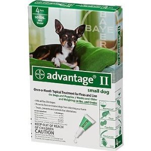 Product Description Biting fleas are more than just a nuisance for your dog. Left unchecked, they can cause serious disorders such as flea allergy dermatitis, secondary skin infections, tapeworms, and even anemia. This topical flea treatment lets you stop fleas before they become a problem. Used just once a month, it begins working in minutes, killing 98 to 100 percent of the fleas on dogs within 12 hours and 99 percent of flea larvae and eggs within 20 minutes. The dead fleas can't lay eggs, and the dead larvae and eggs can't hatch, breaking the flea's life cycle and halting the infestation in its tracks. Any new fleas your dog then encounters are killed within two hours, preventing re-infestation for as long as four weeks. In fact, Advantage II is so effective at breaking the flea's life cycle there's no need to treat your dog's environment. Applied before the start of flea season, it helps keep your dog from becoming infested in the first place. Used year-round, it prevents fleas from over-wintering in your home to feast on your dog next season. Gentle enough for puppies as young as seven weeks, Advantage II is water-resistant and continues to work while your dog swims or is bathed. The package includes four pre-measured doses for dogs 0-10 pounds in easy-to-use applicator tubes. For safety, keep out of the reach of children, and read all warnings and instructions carefully.